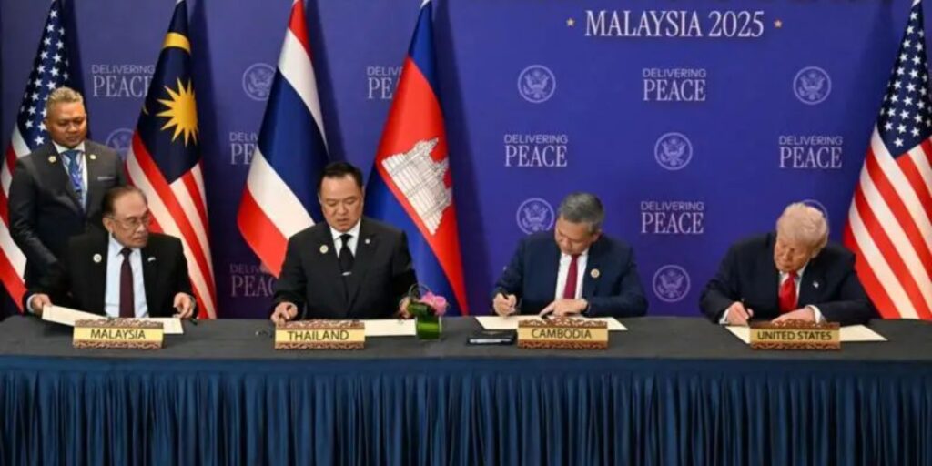 काठमाण्डाैं – अमेरिकी राष्ट्रपति डोनाल्ड ट्रम्पको उपस्थितिमा थाईल्याण्डका प्रधानमन्त्री अनुटिन चार्नविराकुल र कम्बोडियाली प्रधानमन्त्री हुन मानेटले संयुक्त शान्ति सम्झौतामा हस्ताक्षर गरेका छन्।